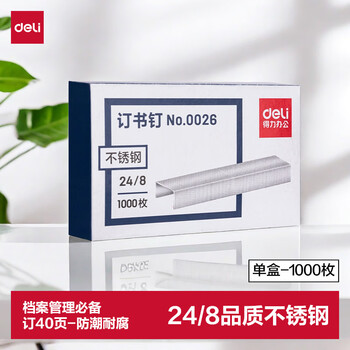 • 得力(deli)24/8加厚不锈钢订书钉/订书针 1000枚/盒 单盒适用重要文件装订防锈不怕潮 可订40页 0026