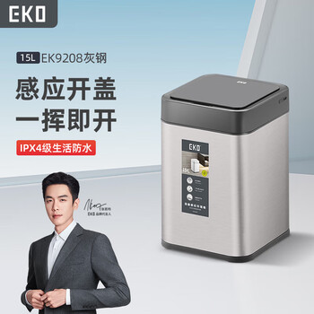 • EKO智能感应垃圾桶15L灰钢家用大号不锈钢卫生间厨房张若昀推荐9208