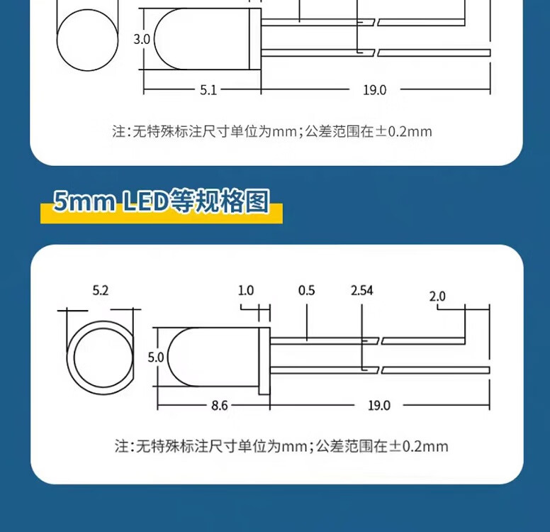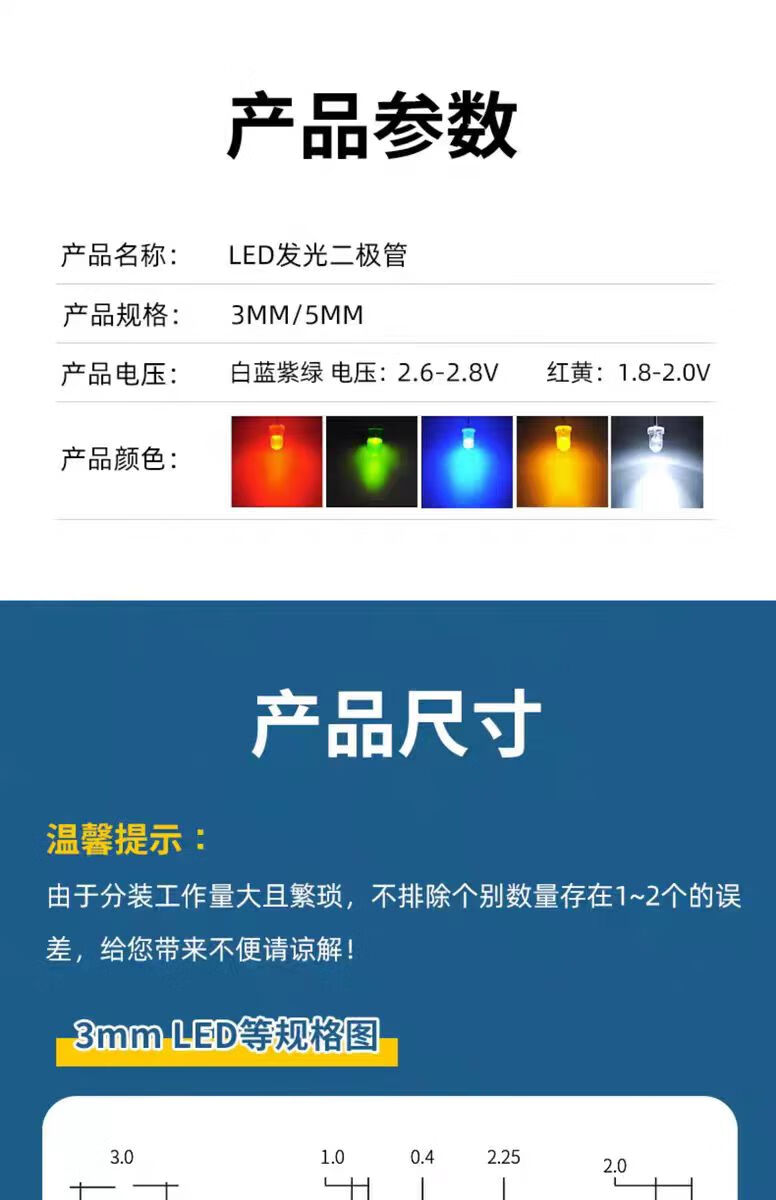 | 规格型号(MPN) | 3MM 红绿黄白蓝5种颜色各50个共250个(1包) |