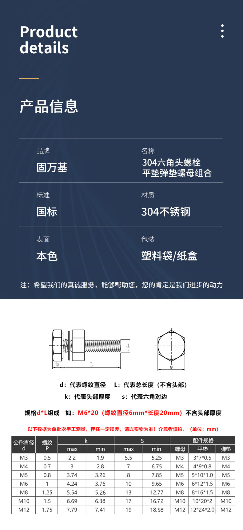 ![固万基(GUWANJI)六角头螺栓平垫弹垫螺母组合 304不锈钢外六角螺丝螺母套装 M6x100[10套/包] 固万基(GUWANJI)六角头螺栓平垫弹垫螺母组合 304不锈钢外六角螺丝螺母套装 M6x100[10套/包]](https://img12.360buyimg.com/n1/jfs/t1/318842/11/12954/46467/6865e732F9da727e2/9b978f724e49a3d9.jpg)