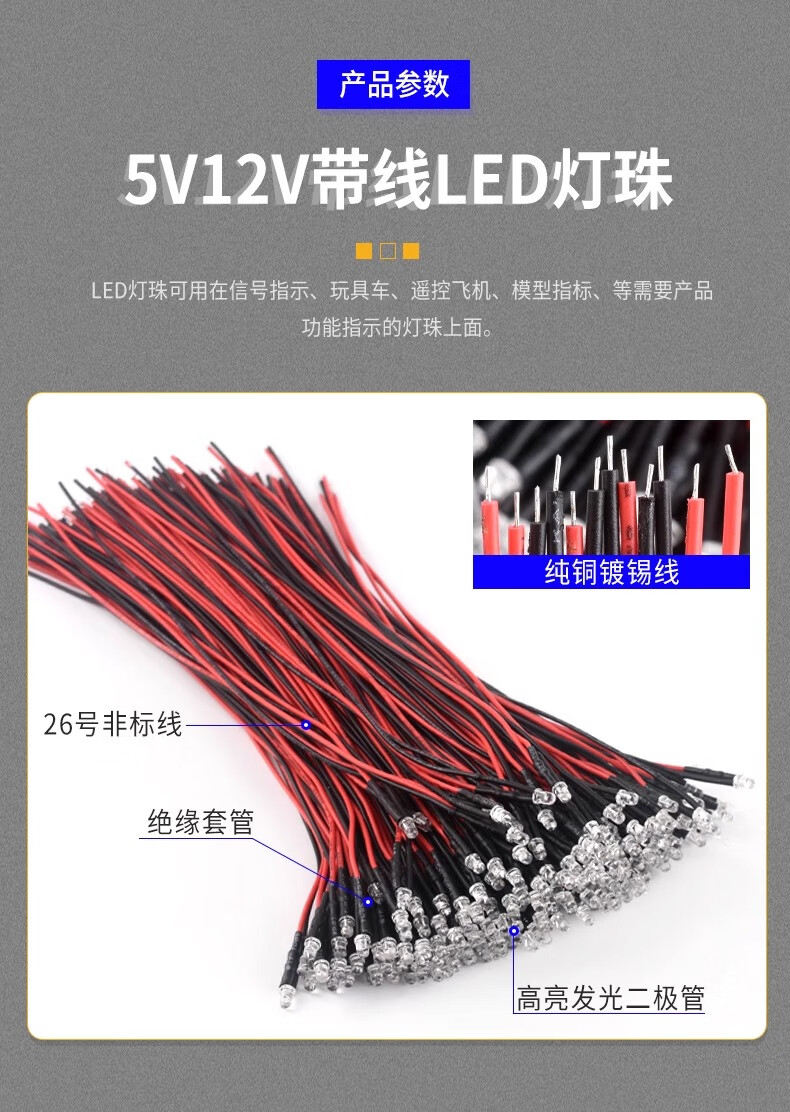 Zave LED灯发光二极管灯珠小灯泡玩具车指示灯 5mm白发绿5V-12V带线20CM(5条)   收藏