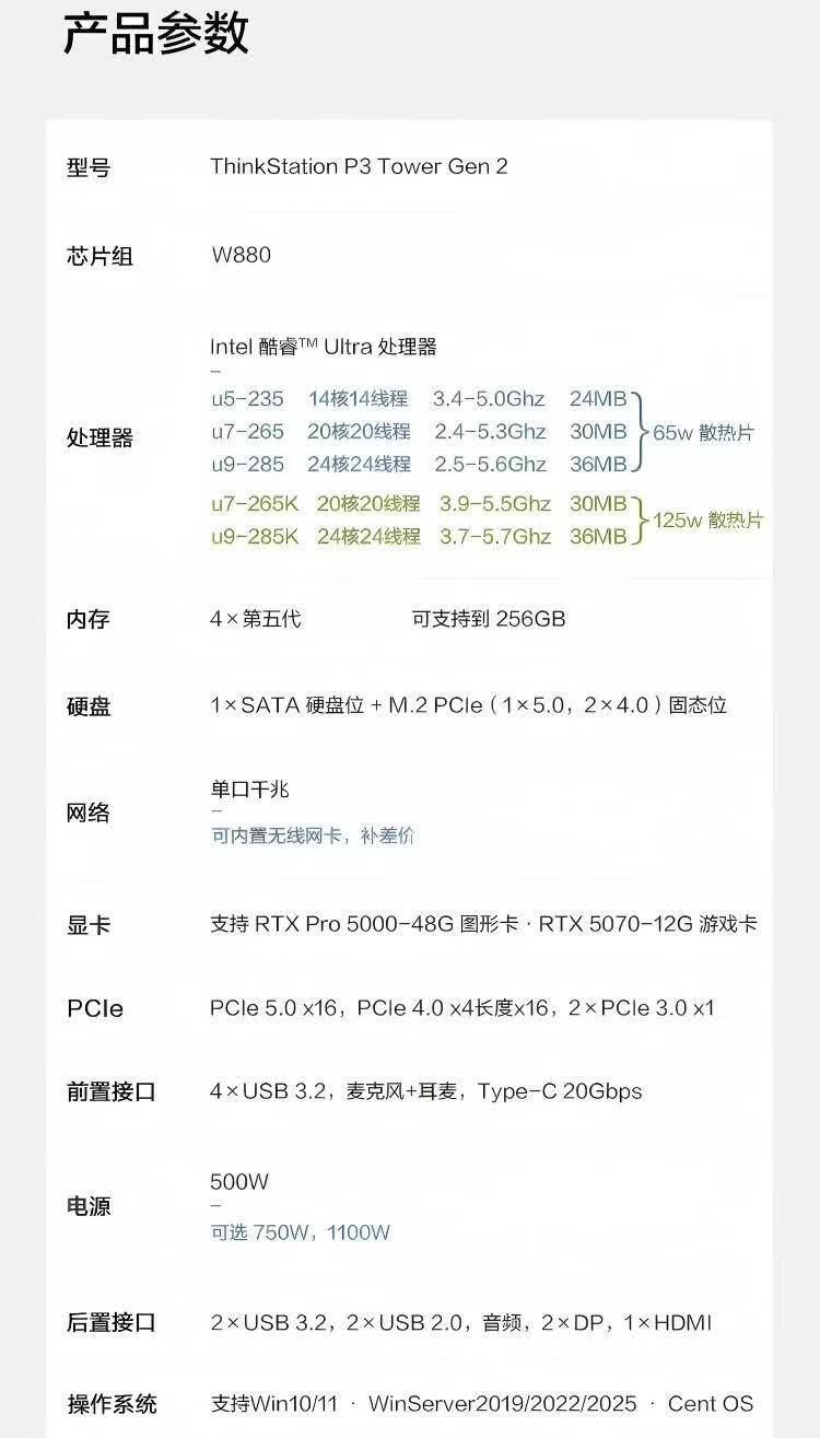 联想ThinkStation P3商用台式图形渲染设计图形工作站 定制(Ultra9 285K 64G 2T+1T SSD 集成)   收藏
