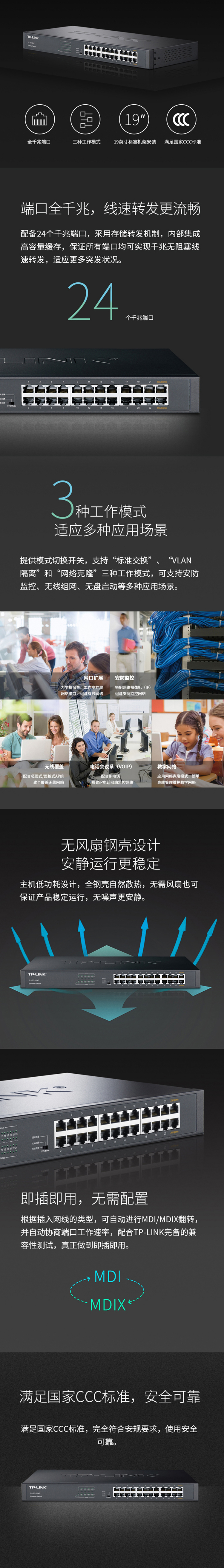 | 特色功能 | 所有端口均具备线速转发能力 支持端口自动翻转(Auto MDI/MDIX)功能 提供标准交换、VLAN隔离和网络克隆三种工作模式,适应不同网络环境 支持通过拨动开关切换交换机工作模式 即插即用,可上机架 |