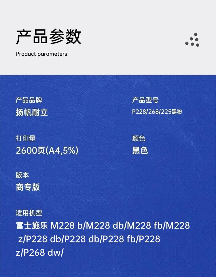 | 适用机型 | 富士施乐 M228 b/M228 db/M228 fb/M228 z/P228 db/P228 db/P228 fb/P228 z/P268 dw/ |
