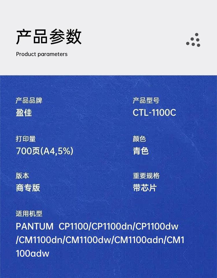 | 适用机型 | PANTUM CP1100/CP1100dn/CP1100dw/CM1100dn/CM1100dw/CM1100adn/CM1100adw |