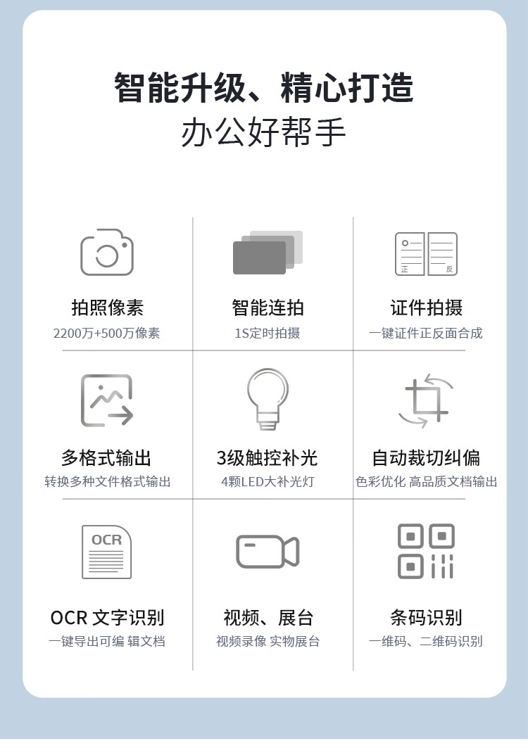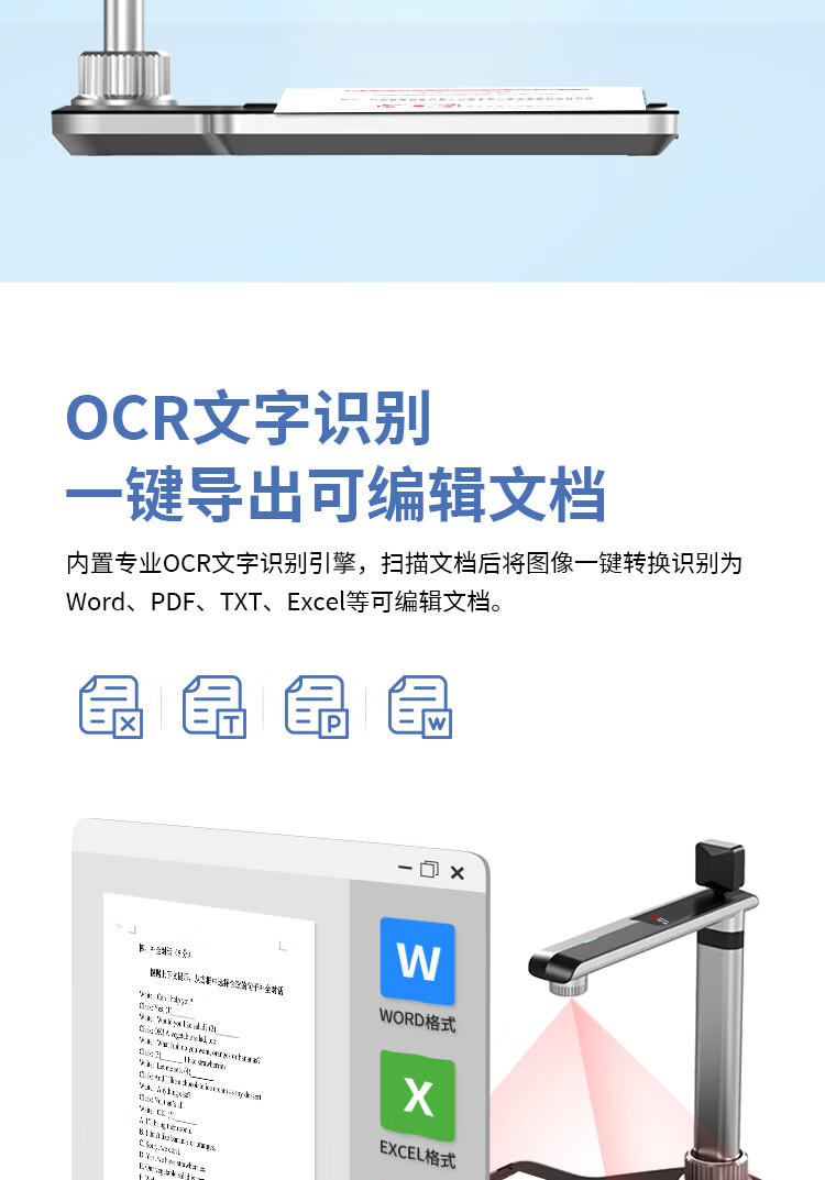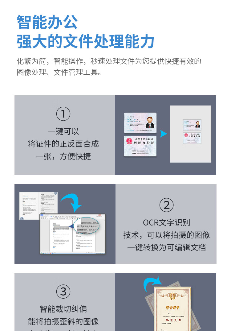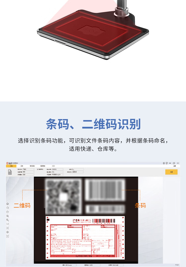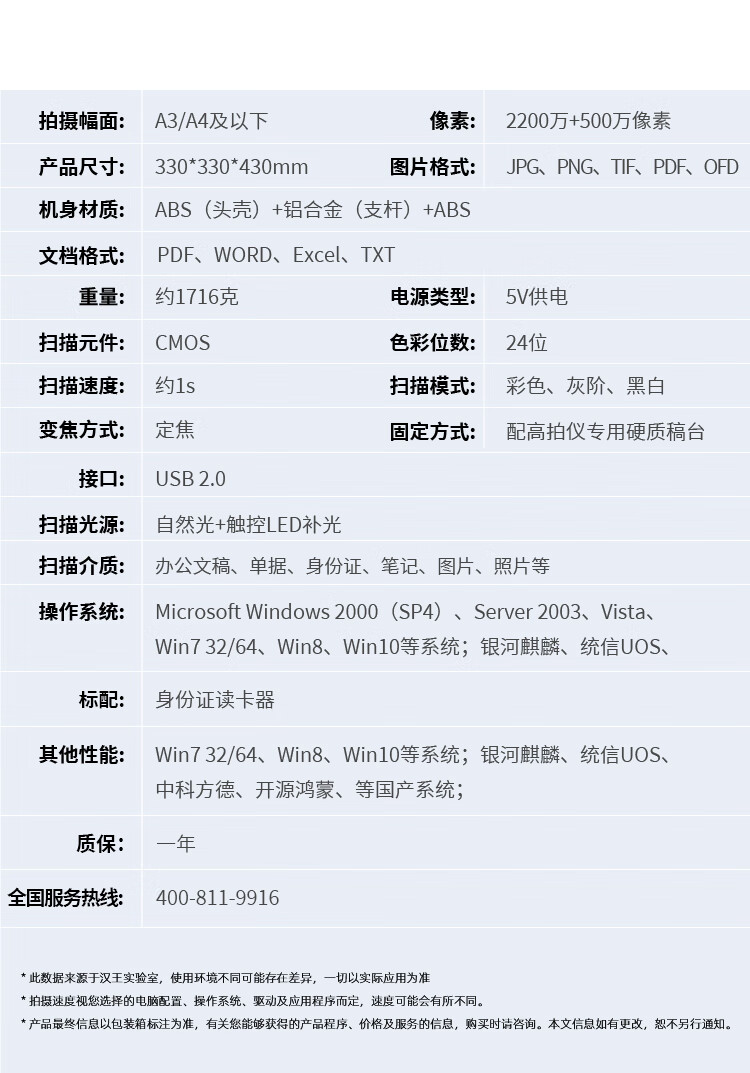 | 扫描介质 | 文件/单据/图片/照片/书籍/票据//资料/实物等各种证件 |