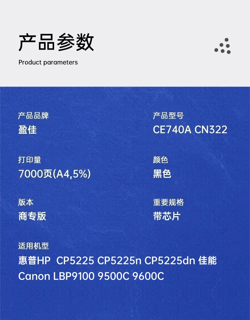 | 适用机型 | 惠普HP CP5225 CP5225n CP5225dn 佳能Canon LBP9100 9500C 9600C |
