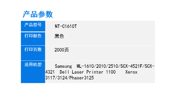 | 适用机型 | Samsung ML-1610/2010/2510/SCX-4521F/SCX-4321 Dell Laser Printer 1100 Xerox 3117/3124/Phaser3125 |