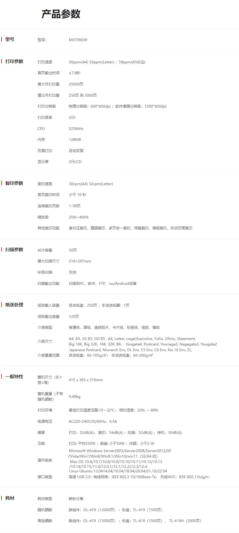 打印速度 | 30ppm(A4);32ppm(Letter);58ppm(A5长边) |