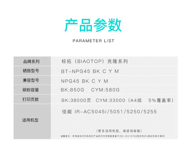 | 适用机型 | 适用佳能iR-AC5045i/5051/5250/5255复印机 克隆系列 |