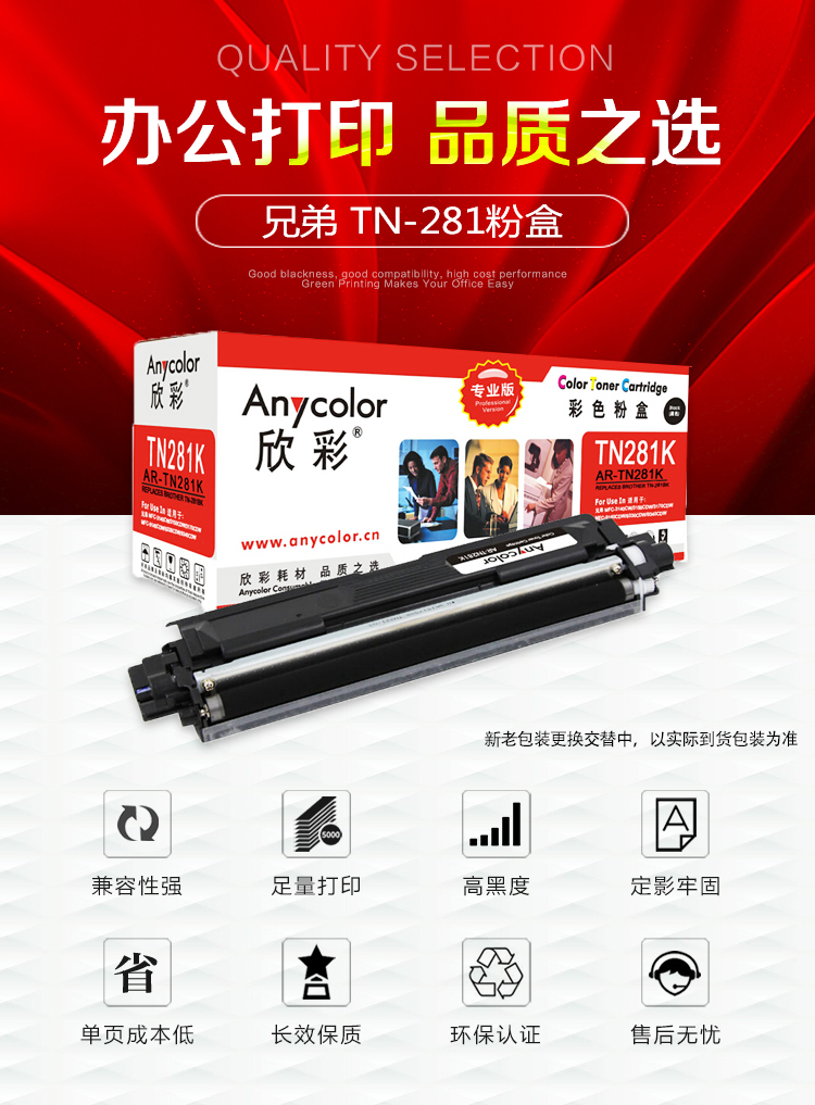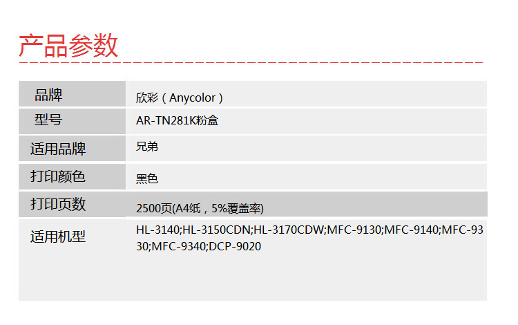 | 适用机型 | 欣彩 AR-TN281BK 专业版粉盒 2500页 黑色 适用兄弟3170CDW 3150CDN 9020CDN 9140CDN |