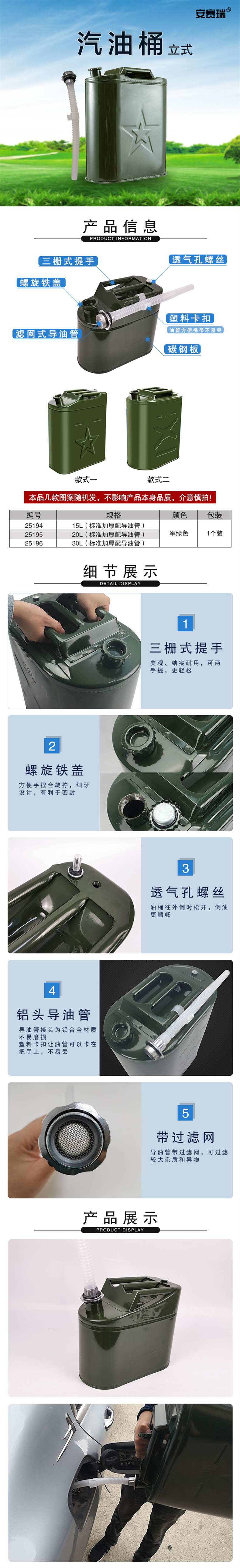 • 安赛瑞 25196 立式铁皮汽油桶 30L 军绿色按箱销售