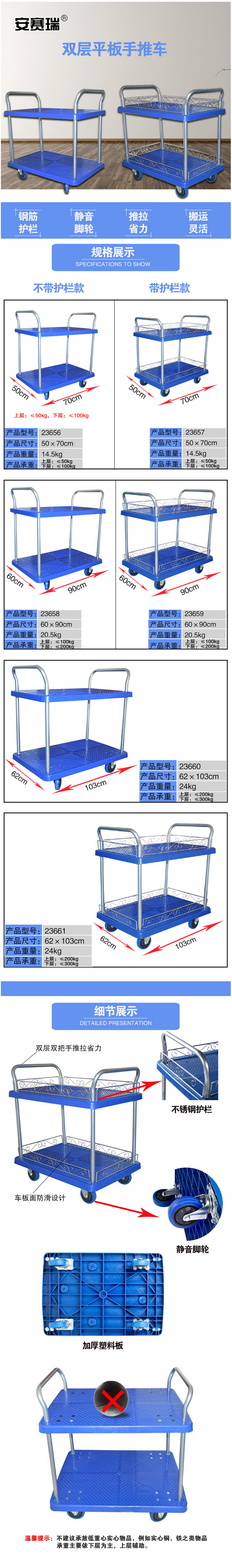 供应商:史泰博 品牌:安赛瑞 产地:中国 重量:14.500KG 销售单位:辆 包装清单:双层平板手推车*1