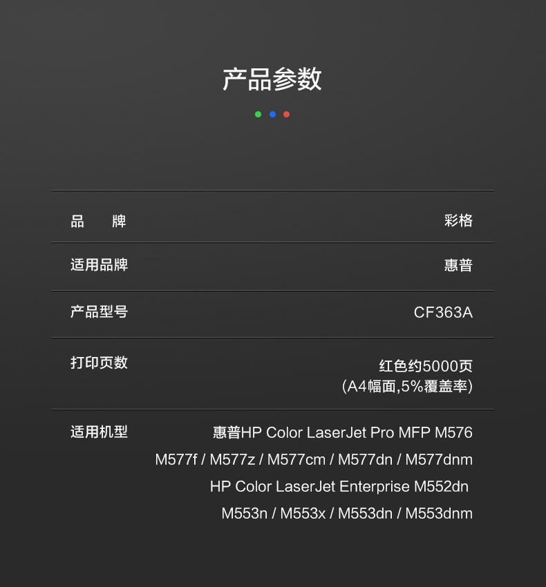 | 适用机型 | 适用于惠普HP Color LaserJet Pro MFP M576;M577f;M577z;M577cm;M577dn;M577dnm;HP Color LaserJet Enterprise M552dn;M553n;M553x;M553dn;M553dnm |
