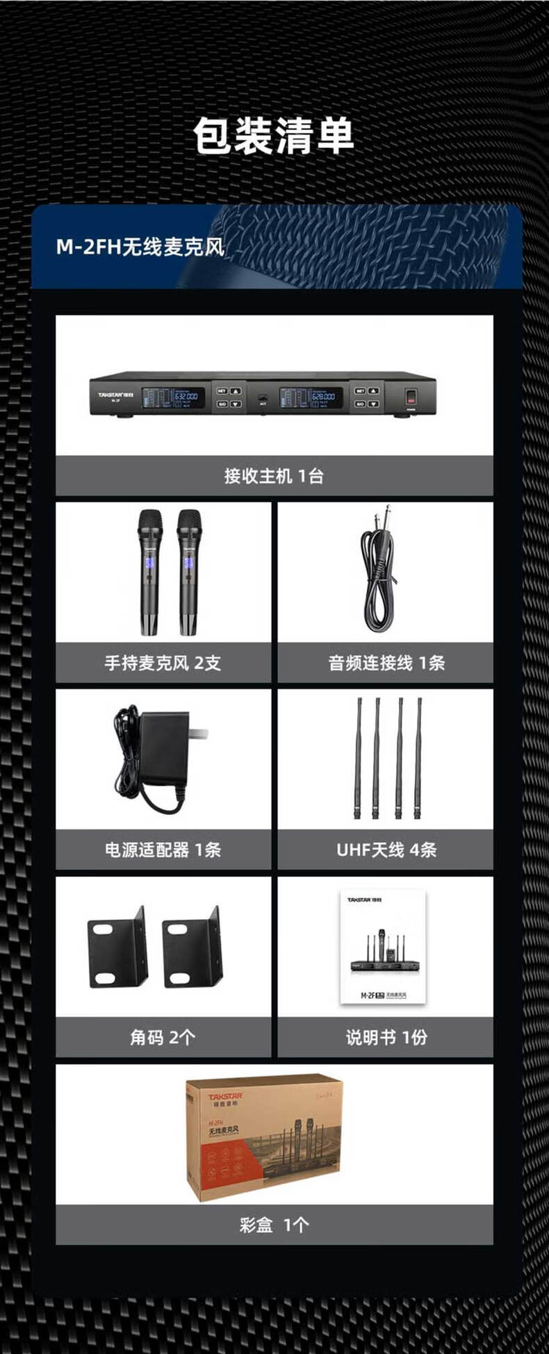 供应商:史泰博 品牌:得胜 产地:中国 销售单位:台 包装清单:M-2FH无线麦克风 • 接收主机 1台 • 手持麦克风 2支 • 音频连接线 1条 • 电源适配器 1条 • 角码 2个 • 说明书 1份 • UHF天线 4条