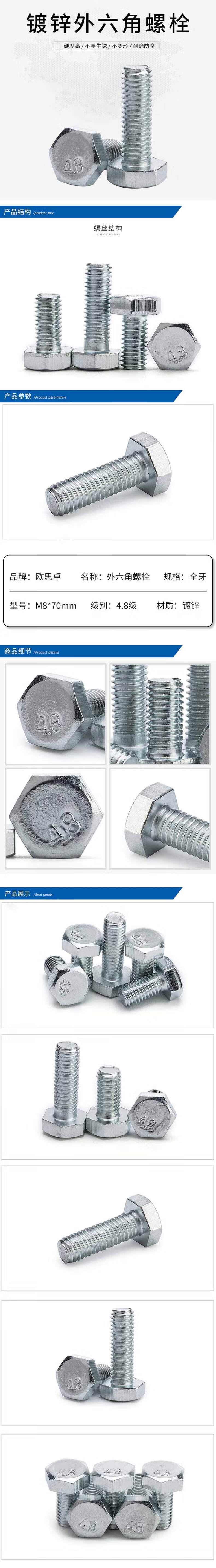 • 欧思卓 M8*70mm 外六角螺栓  4.8级GB/T 5781 全牙 镀锌 100个/包按包销售